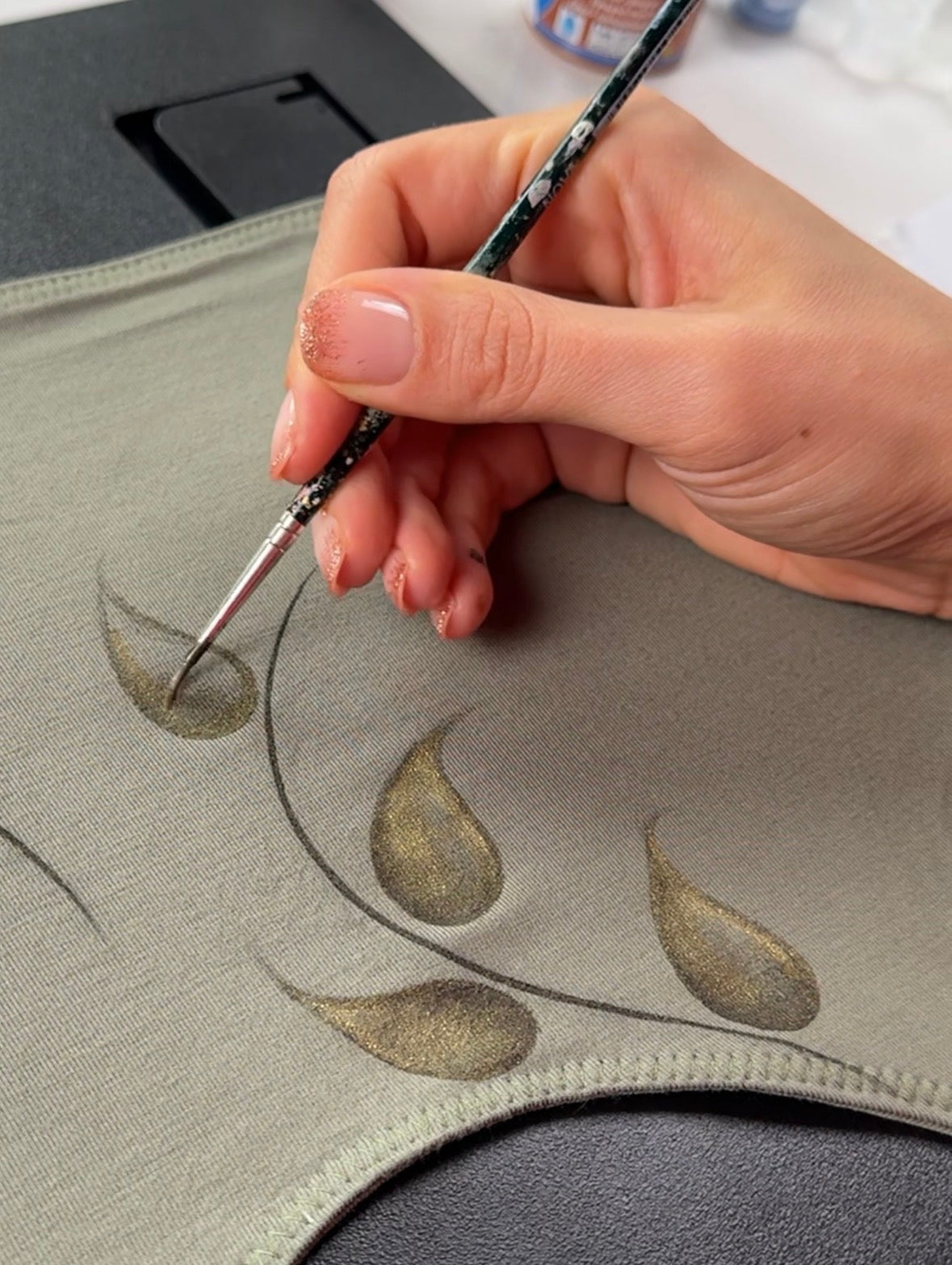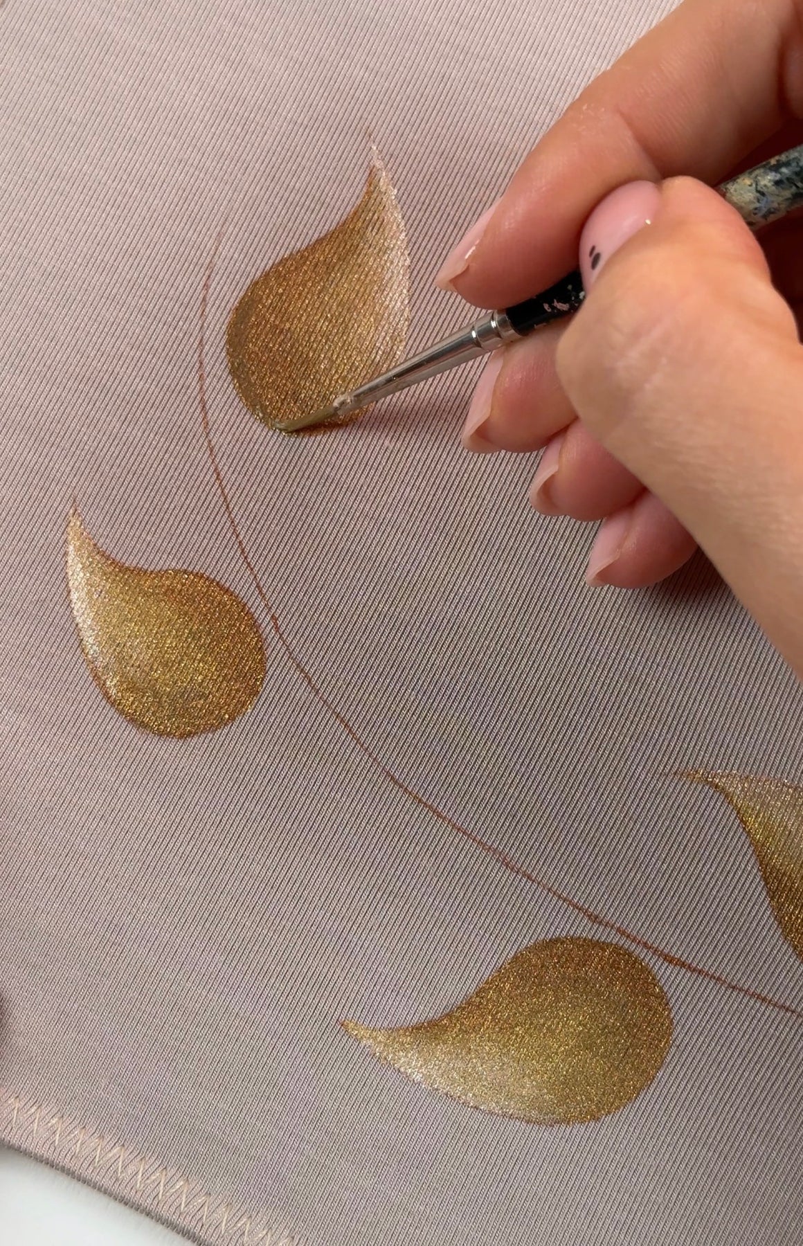 The design is created directly on the garment using special pigments, enriched with touches of real gold leaf.